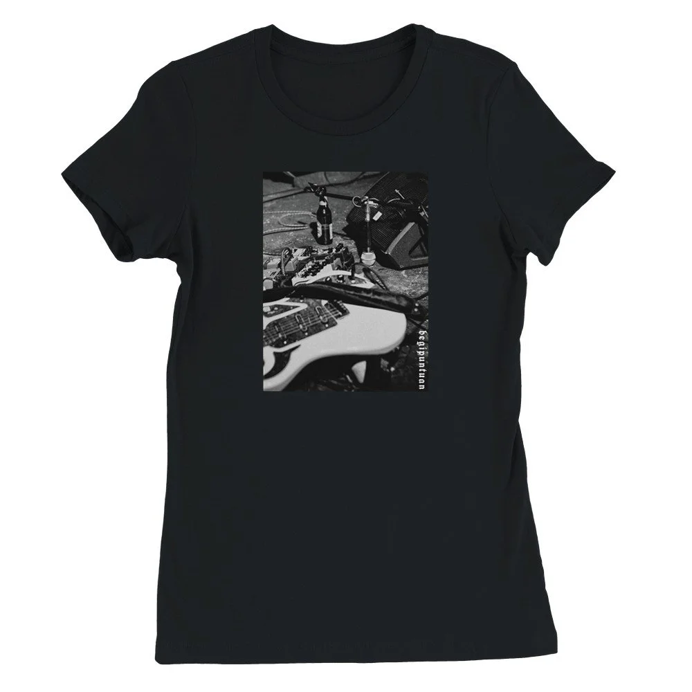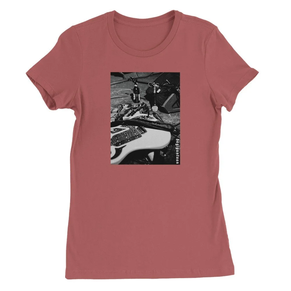 Erotirako mikroa, botatako gitarra, garagardoa eta pedalak. Kontzertu baten amaiera argazki batean. Pinpilinpussies taldea Ondarruko gaztetxean. Kotoi leunarekin egindako kamiseta. Arina, goxoa eta eguneroko bizitzarako pentsatua.